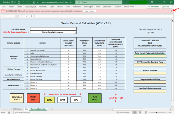 The Water Demand Calculator requires a compatible version of Excel 2009 or later to prevent loss of functionality as it uses active content (macros). For security reasons, the Microsoft Office has security features that disables the macros with a warning message. The message advises the user that active content has been detected.  This does not mean that viruses have been detected. The source file comes from IAPMO, so the file can be trusted, and the macros can be enabled. Once the file is trusted, the warning will no longer appear. You may also need to check with your company's system's administrator for security permission to download a file with macros.